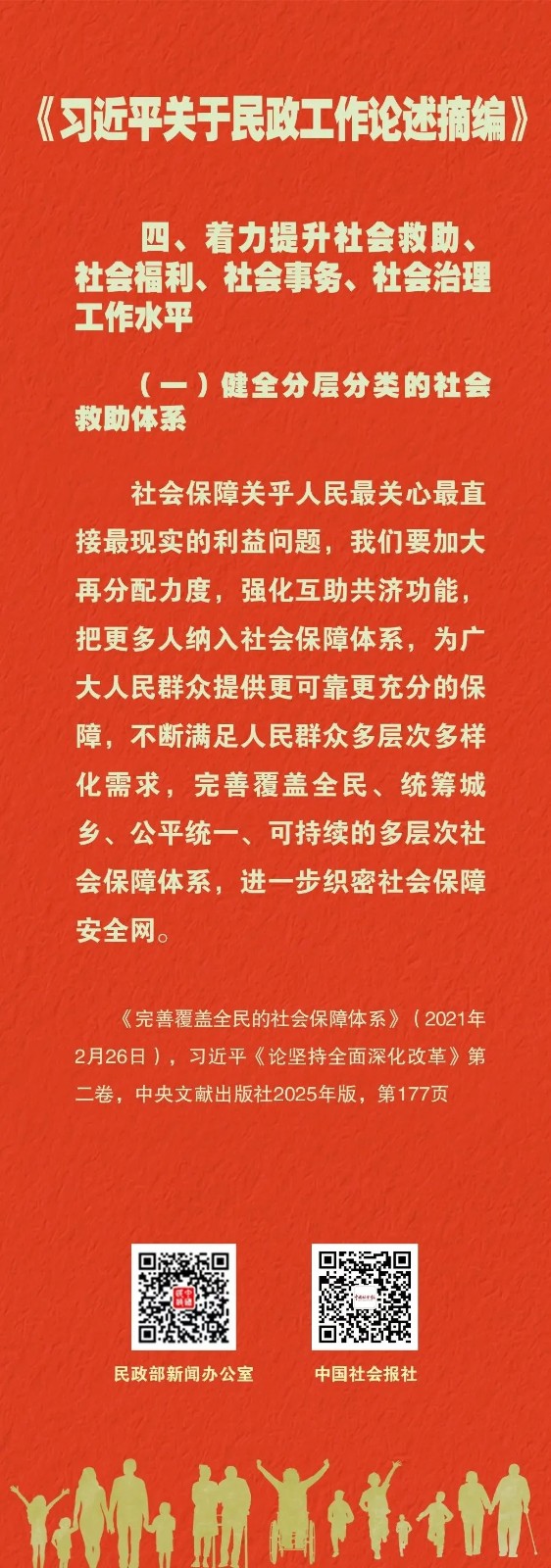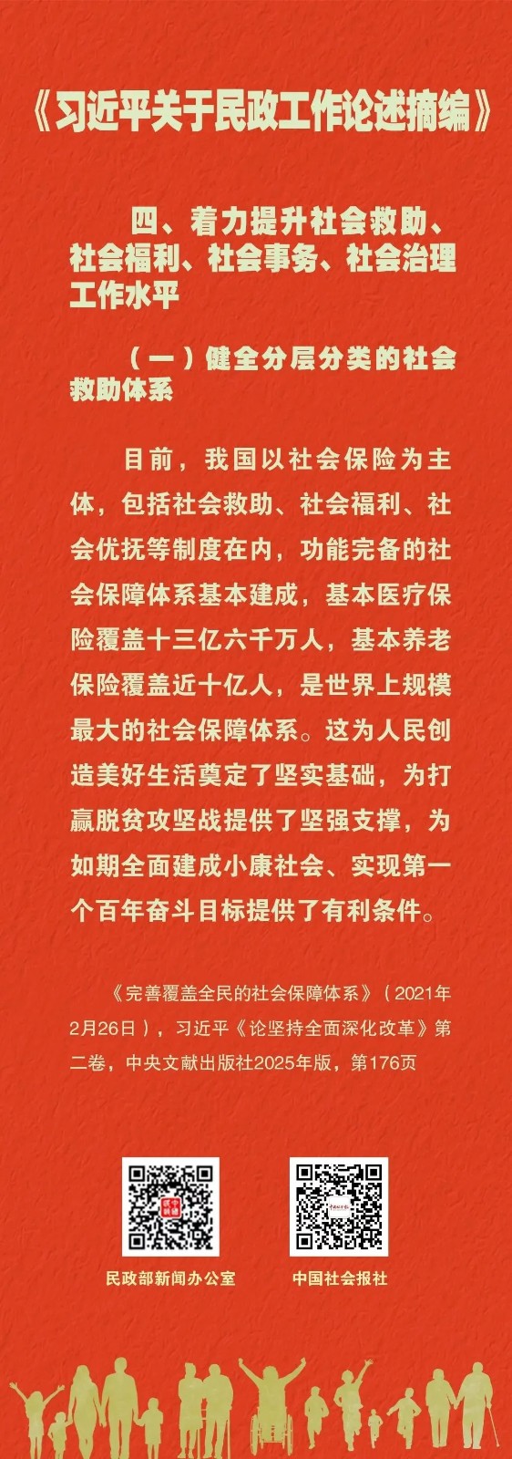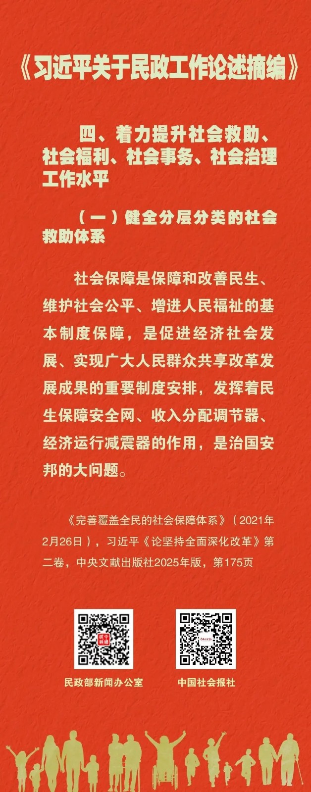 学习课堂丨《习近平关于民政工作论述摘编》(37) 来源:本站原创 | 发布人:admin | 发布时间:2026-04-20 | 浏览次数:119 《习近平关于民政工作论述摘编》(以下简称《论述摘编》)已出版发行。《论述摘编》全面反映习近平总书记对新时代民政工作的深邃思考和重大部署,为深入学习领会习近平总书记重要论述提供了权威读本和最新教材。《论述摘编》分6个专题,共计224段论述,摘自习近平同志2012年11月至2025年7月期间的报告、讲话、指示、批示等160多篇重要文献。其中部分论述是第一次公开发表。“学习课堂”推出系列海报,与您一起学习。来源:中国民政 返回