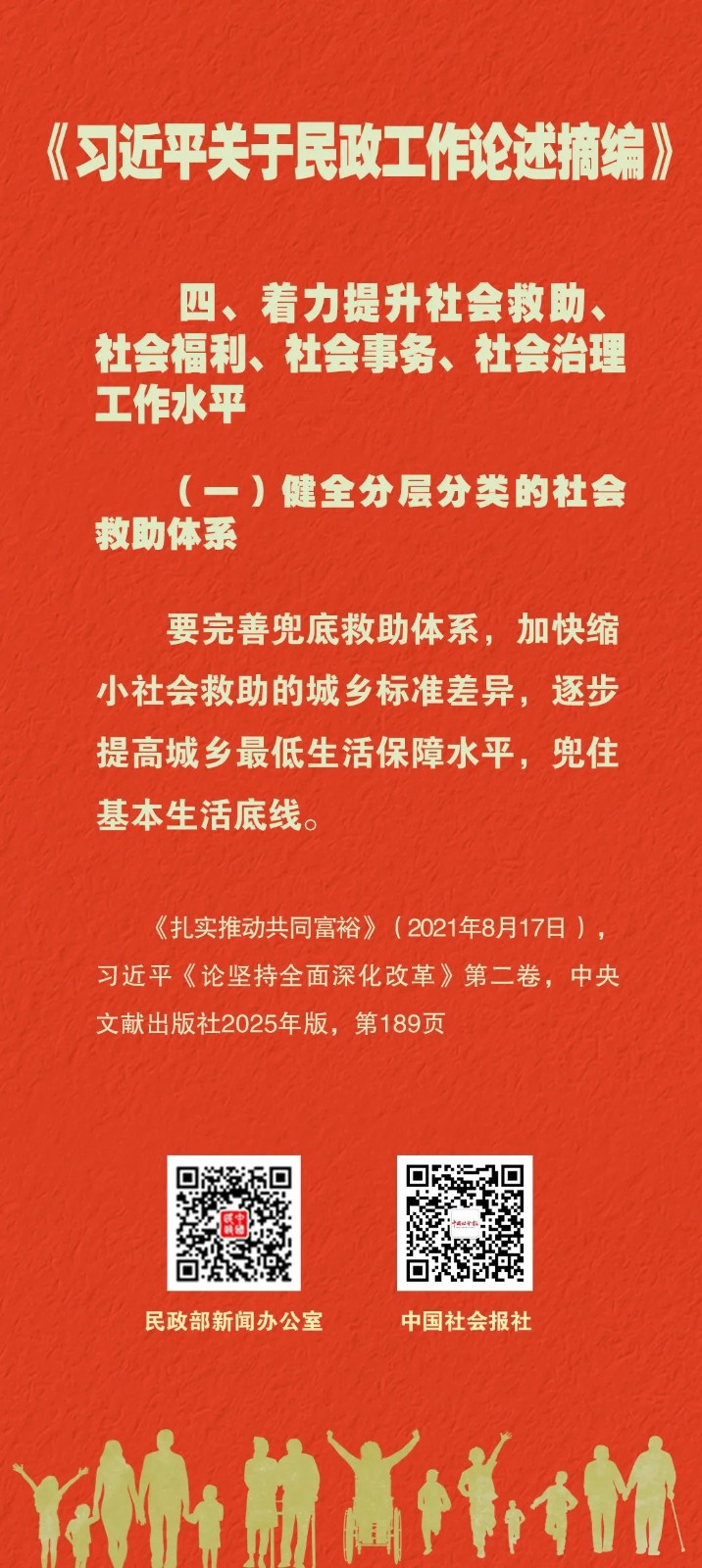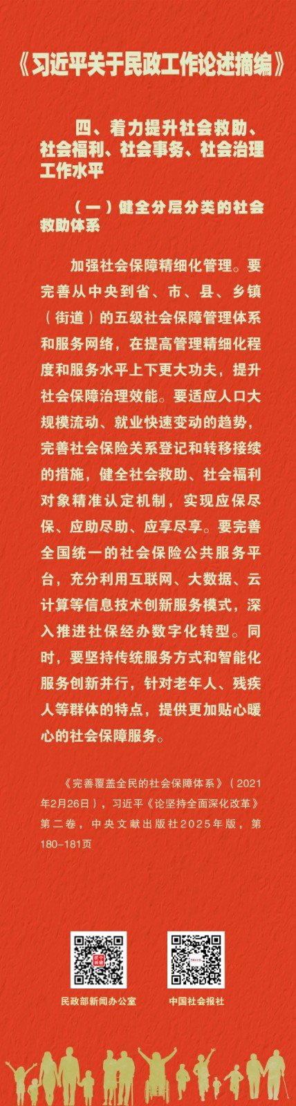 学习课堂丨《习近平关于民政工作论述摘编》(38) 来源:本站原创 | 发布人:admin | 发布时间:2026-04-21 | 浏览次数:85 《习近平关于民政工作论述摘编》(以下简称《论述摘编》)已出版发行。《论述摘编》全面反映习近平总书记对新时代民政工作的深邃思考和重大部署,为深入学习领会习近平总书记重要论述提供了权威读本和最新教材。《论述摘编》分6个专题,共计224段论述,摘自习近平同志2012年11月至2025年7月期间的报告、讲话、指示、批示等160多篇重要文献。其中部分论述是第一次公开发表。“学习课堂”推出系列海报,与您一起学习。来源:中国民政 返回